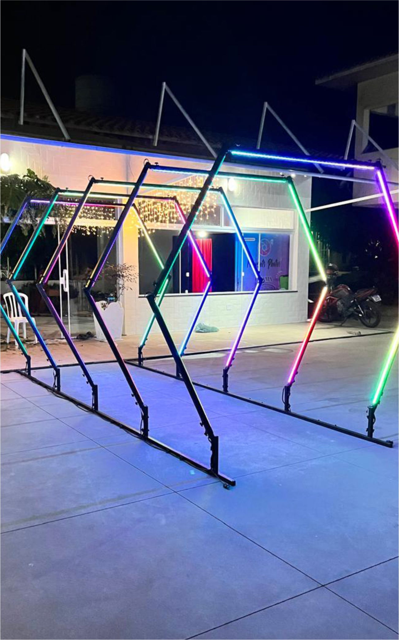 Os concorrentes por não investirem no sistema endereçável, que é o mais caro do mercado, colocam o LED tradicional, mais conhecido como RGB, que ficam piscando apenas 3 cores diferentes, vermelho, verde e azul, a estrutura infelizmente acabou se tornando padrão, com esse desenho hexagonal, para que o cliente acredite de que se trata do verdadeiro Túnel de LED, e infelizmente o cliente só vai perceber na hora do evento.